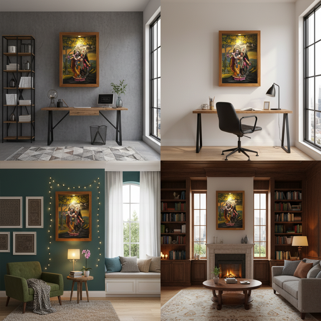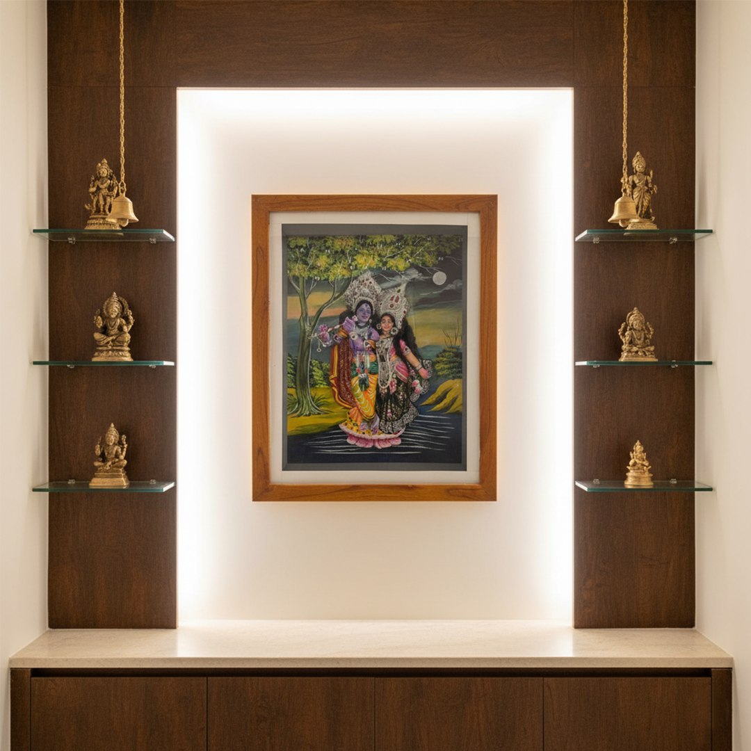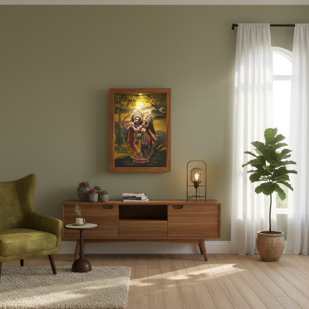 Depicts the eternal bond of Radha and Krishna, symbolizing love, positivity, and spiritual harmony.