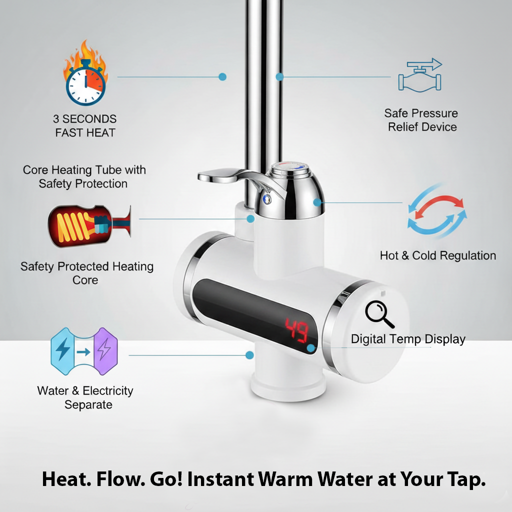 Instant Electric Mini Geyser Tap – Fast Heating, Instant Hot & Cold Water Heater for Kitchen Sink & Bathroom Basin, Easy to Install, Energy Efficient with Temperature Display.
